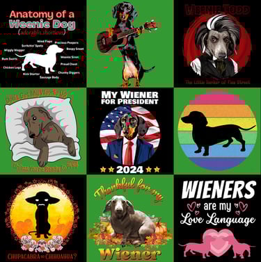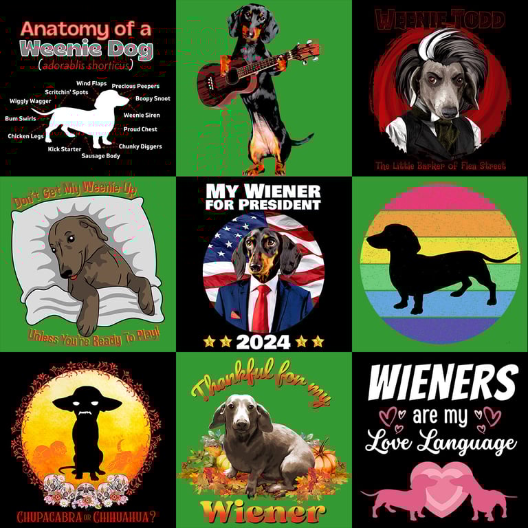 Just a handful of our popular designs. Available on quality products @WeenieRiot on Etsy.